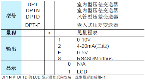 3.零點在中間的定義:選型最后加Z。如DPT1xxZ,代表滿量程60/125Pa,零點在中間,即實際為-30-0-30Pa/-62.5-0-62.5Pa,但25Pa無此功能。如DPT3xxZ,代表滿量程250/500/1000Pa,零點在中間,即實際為-125-0-125Pa/-250-0-250/-500-0-500Pa。選項6無此功能。