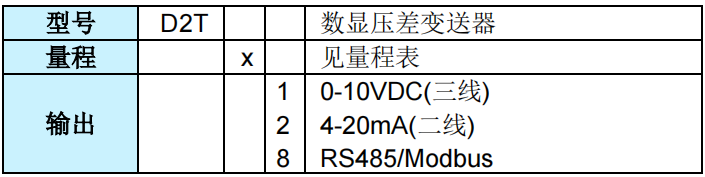 2.零位在中間的定義:選型最后加Z。如D2T1xZ,代表滿量程60Pa,零位在中間,即實(shí)際為-30-0-30Pa。僅量程1~6可選。