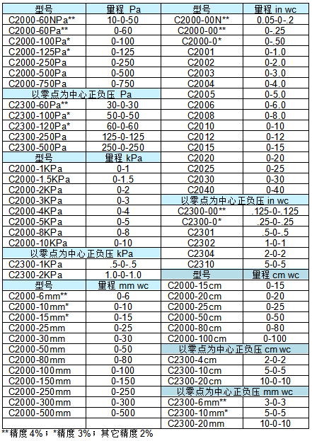 精度:±2%FS (125Pa: ±3%FS, 60Pa: ±4%FS) @20~26°C