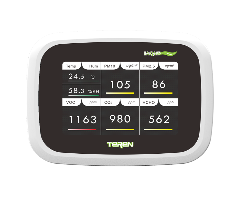 基于客戶需求,TEREN推出新品,IAQMP彩屏顯示多功能空氣質量探測器,該產品可同時檢測多種室內環境空氣,包括VOC、CH2O、PM2.5、PM10、CO2、T和RH。