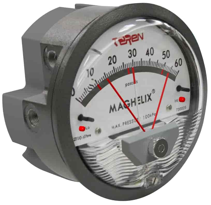 壓差開關部分設置了高、低兩組開關,在產品面罩上設置了一個旋鈕,可通過旋鈕設定開關數值,由紅色指針指示,顏色醒目。
